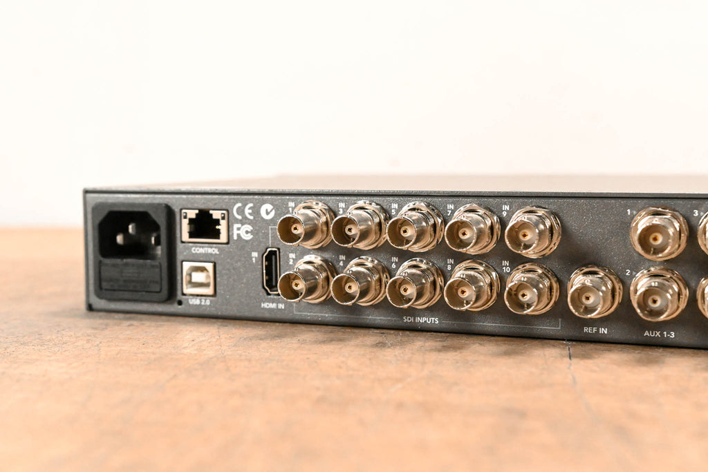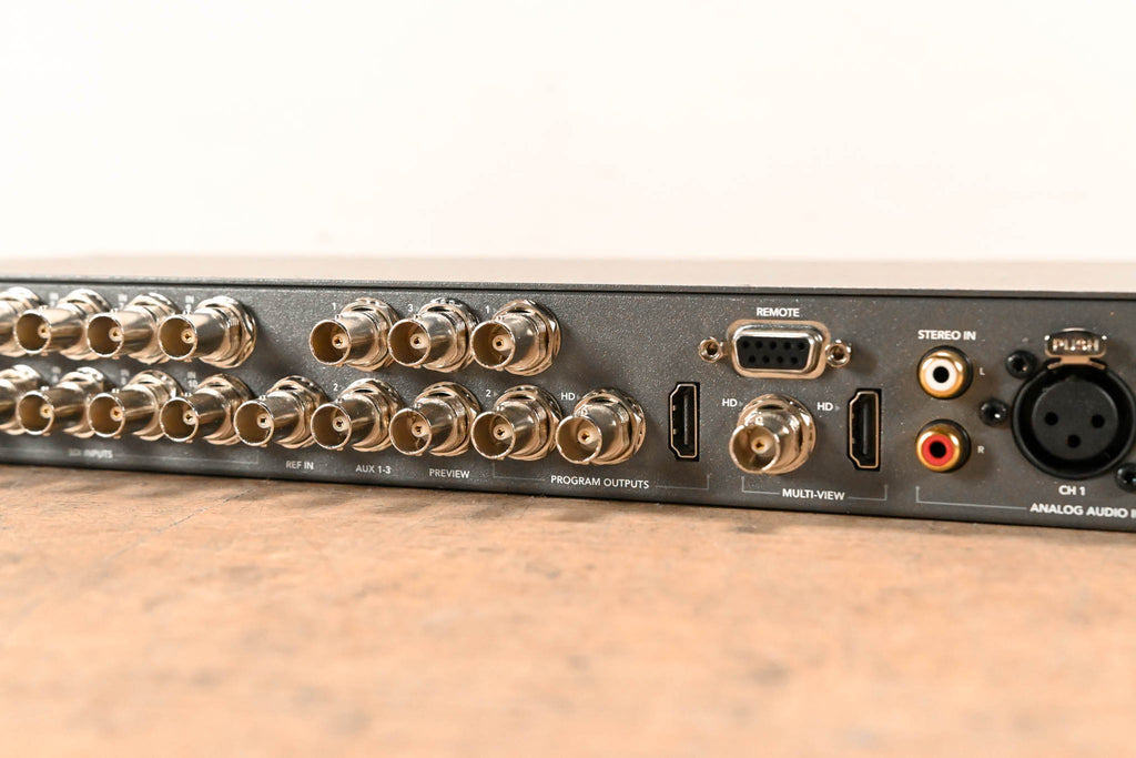 Supports NTSC/PAL/HD/UHD 4K at 10-bit Supports 4K Resolution over SDI or HDMI 1 x HDMI & 10 x 6G-SDI Inputs Tri-Sync/Black Burst Ref Sync Input 10 x Built-In Frame Synchronizers Multiview Monitoring in HD Program Outputs in UHD/HD/SD 4 x Keyers Total: 3 x Luma, 1 x Chroma