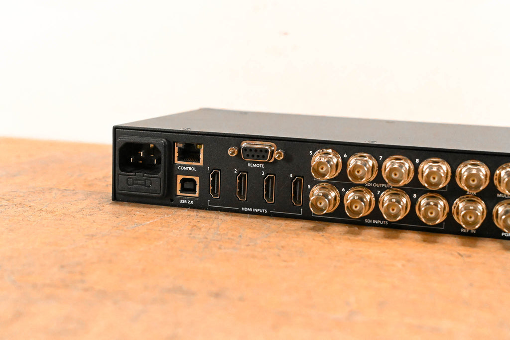 8-Channel SDI/HDMI Switcher NTSC/PAL, HD, Computer Signal Compatible 10-Channel Digital Audio Mixer Built-In Front Panel Controls Multiview Output through HDMI and SDI Upstream and Downstream Keyers DVE for Transitions and Keyers Photoshop Plugin for Graphics Media Players