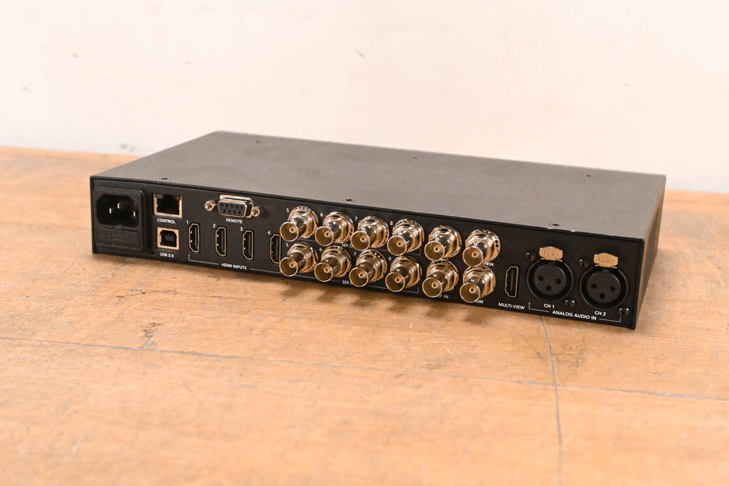8-Channel SDI/HDMI Switcher NTSC/PAL, HD, Computer Signal Compatible 10-Channel Digital Audio Mixer Built-In Front Panel Controls Multiview Output through HDMI and SDI Upstream and Downstream Keyers DVE for Transitions and Keyers