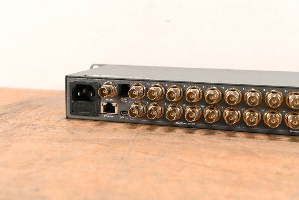 Routing Switcher 12 x 6G-SDI Inputs / 12 x 6G-SDI Outputs Supports SD, HD, Ultra HD 4K, DCI 4K 4:2:2 and 4:4:4 Sampling 10-Bit Processing SDI Reclocking Built-In LCD with Spin Knob Control Push Buttons on Front Panel Ethernet for Remote Control