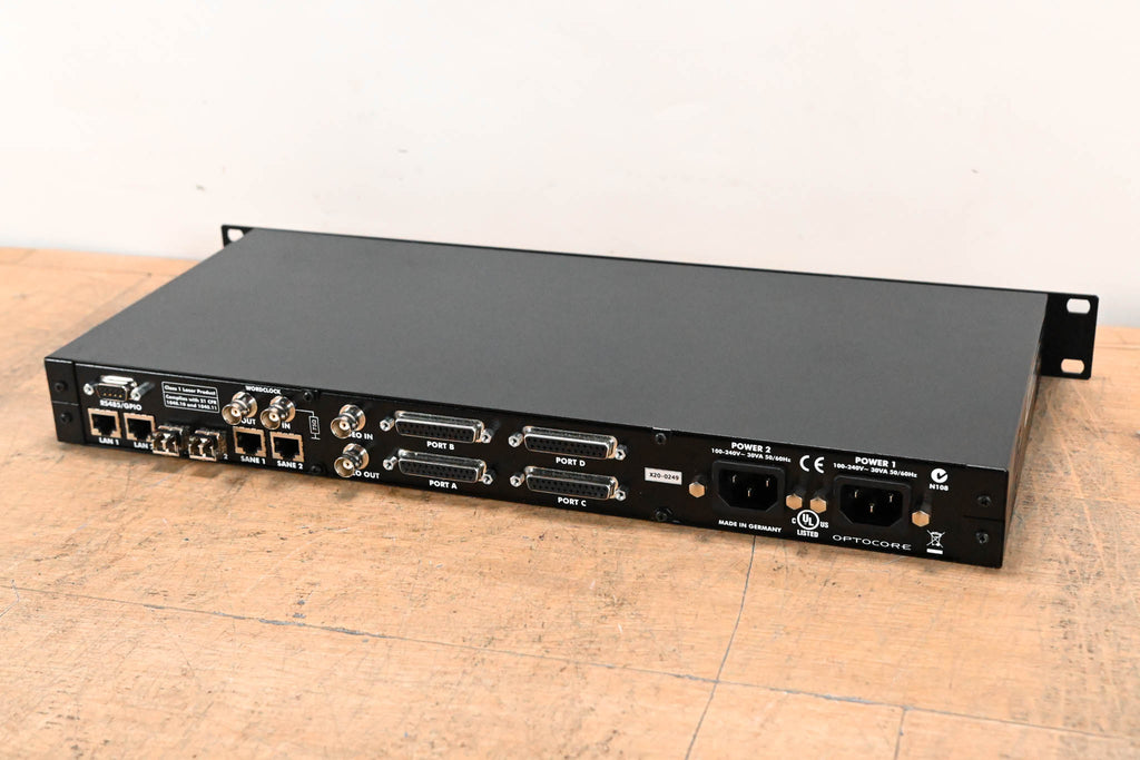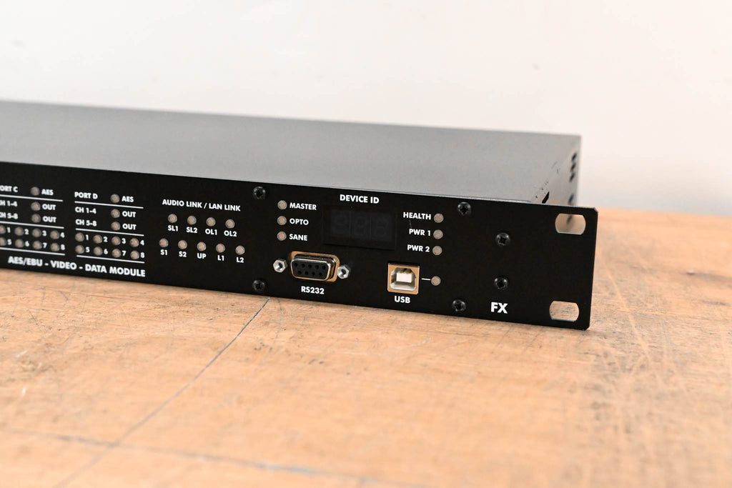 64 channel AES audio I/O SANE transport device 32 AES/EBU digital audio pairs = 64 channels Unique software switch to use as AES/EBU inputs or outputs. 2 optical 2G links for the Optocore Network with hot-swappable SFP modules 2 SANE Ports 2 LAN Ports 4 RS485 interfaces for the exchange of control data. Word clock I/O
