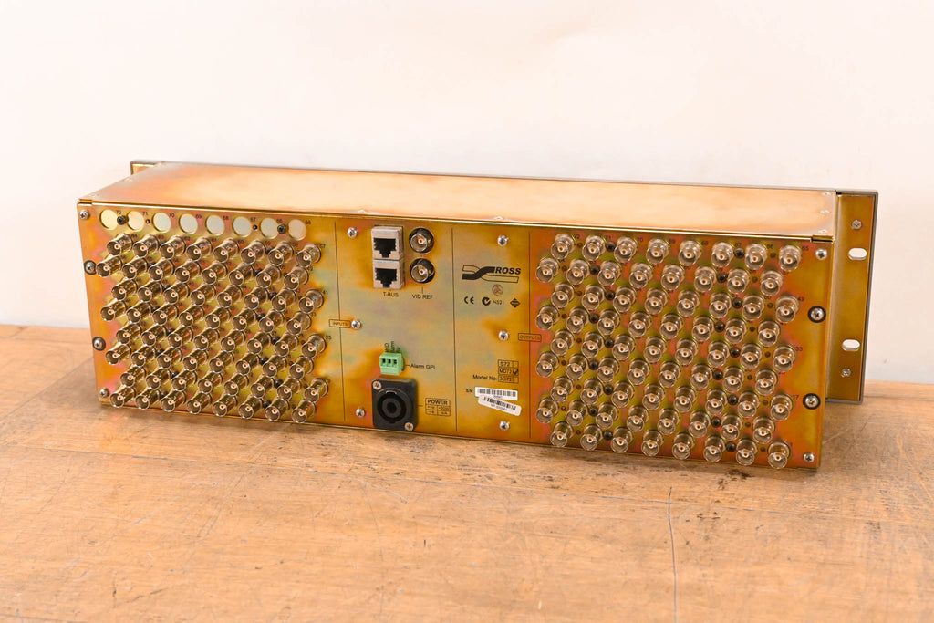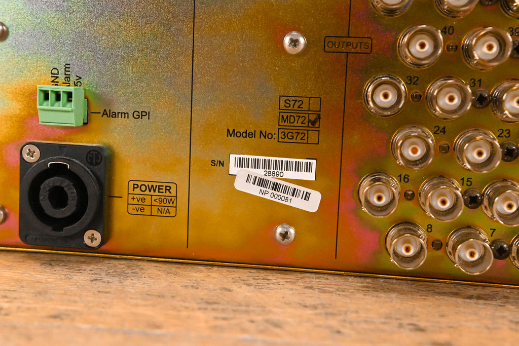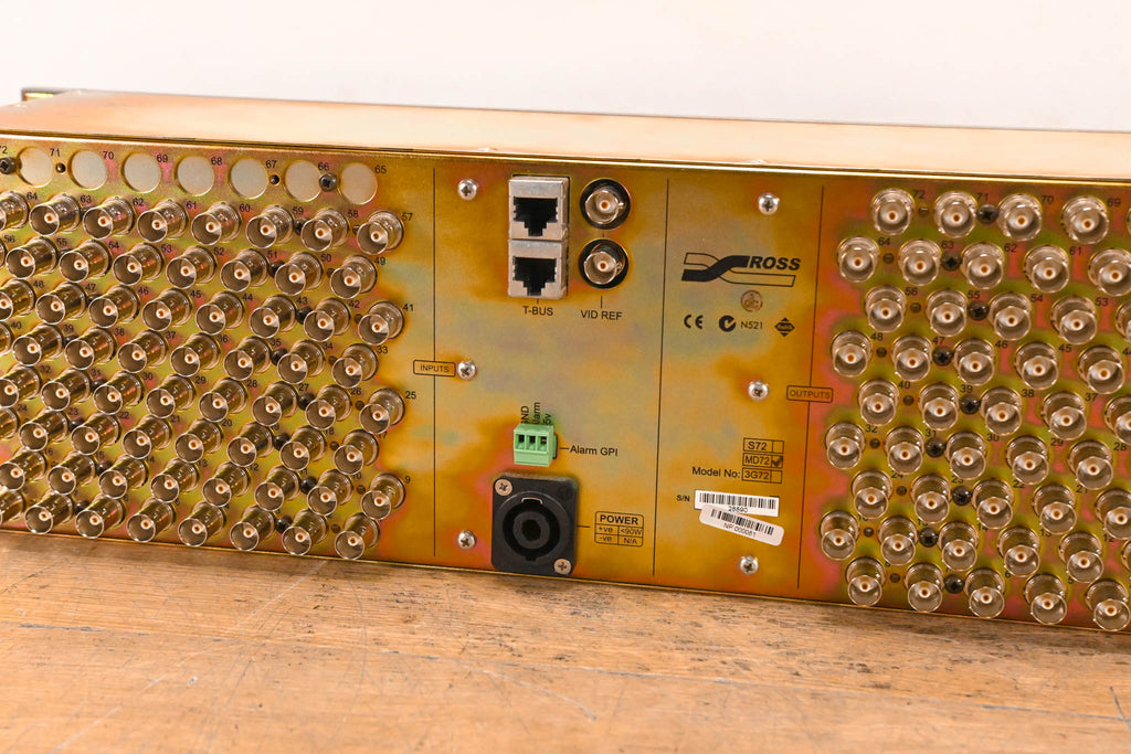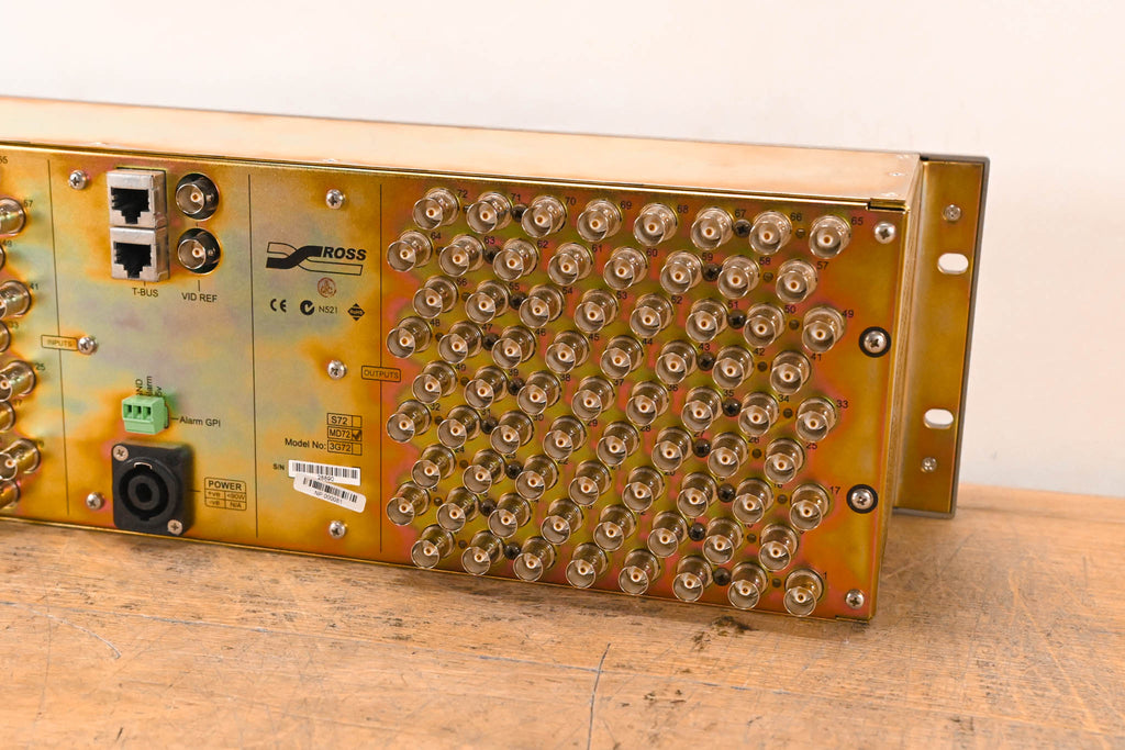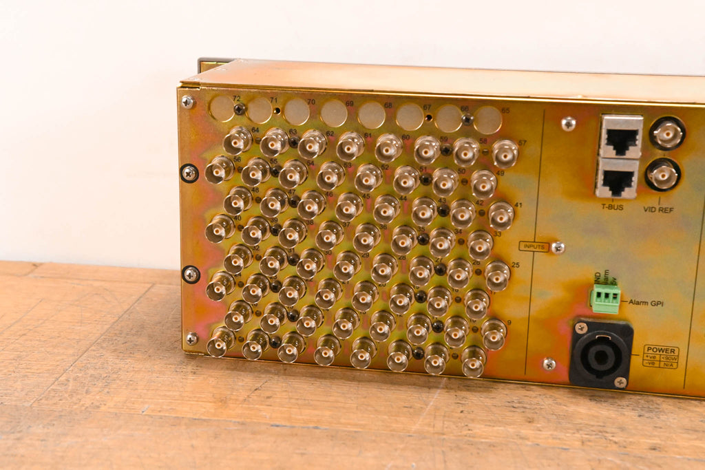 Inputs 65–72 are not populated and do not have connectors installed. Number of Inputs: 64 Number of Outputs: 72 Data Rates: 143Mbps to 1.485Gbps Connectors: 75ohm BNC Input Cable Equalization: up to 100m Belden 8281 Input Return Loss: >17 dB Clocking: Non-Reclocking Output Return Loss: 15 dB Output Level: 800 mV (Peak to peak) Output Jitter: <0.2 UI Output Overshoot: <10% Output Rise Time: Selectable SD/HD rise time