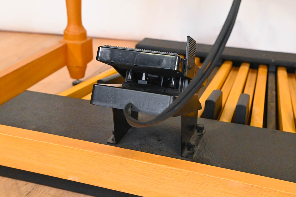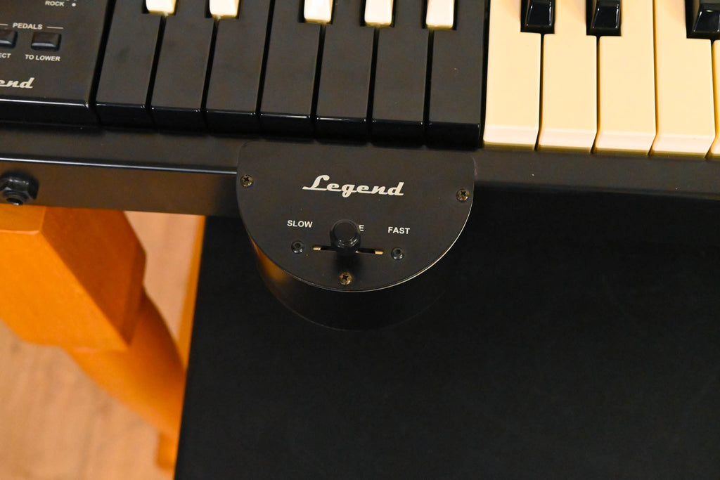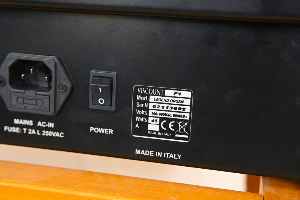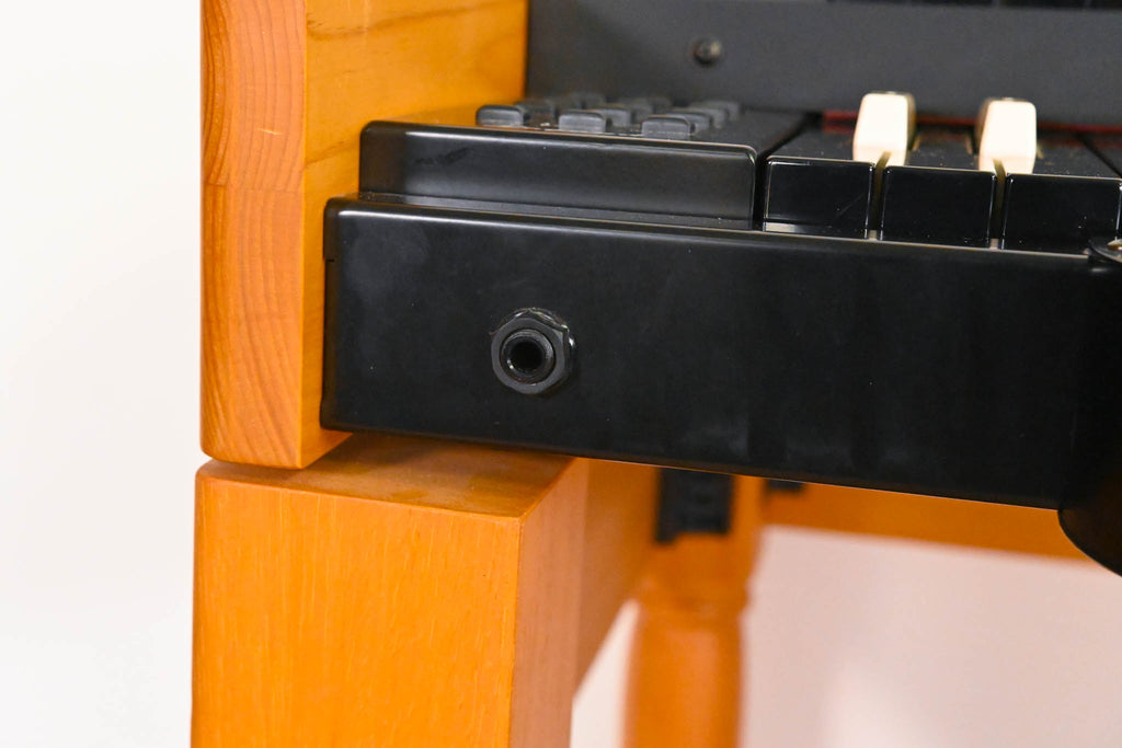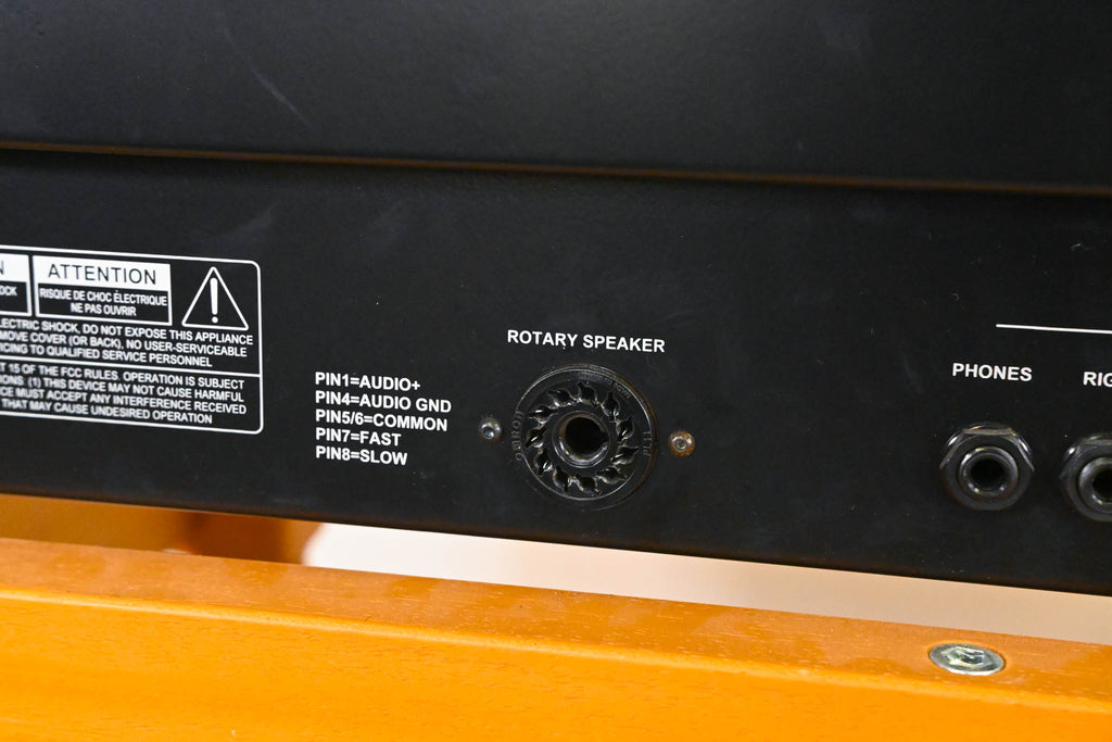 Includes the dedicated organ stand, music rest, matching bench, and full pedalboard assembly. Rotary is not included.